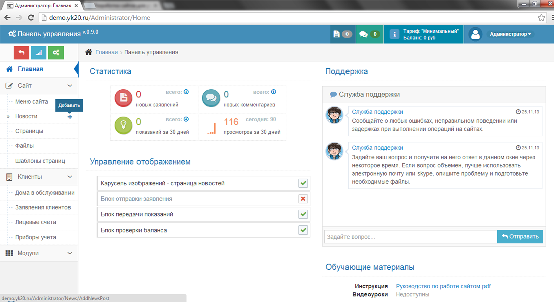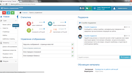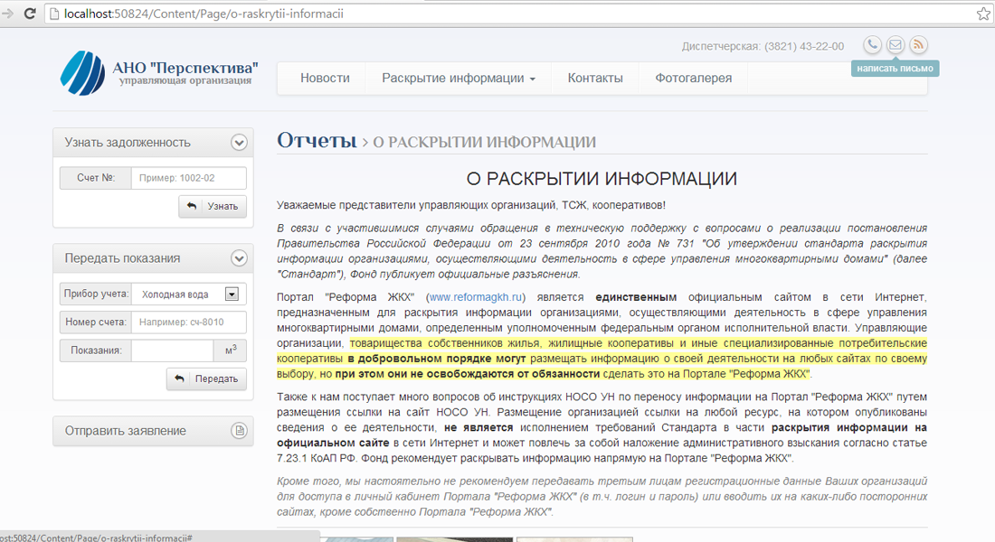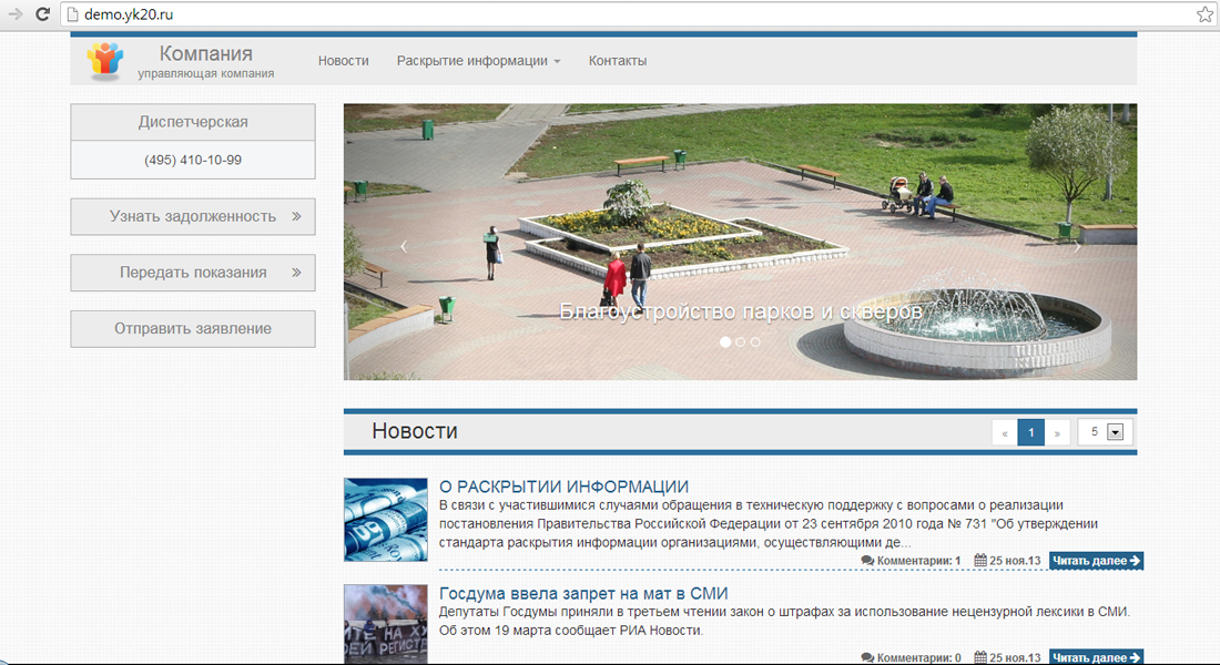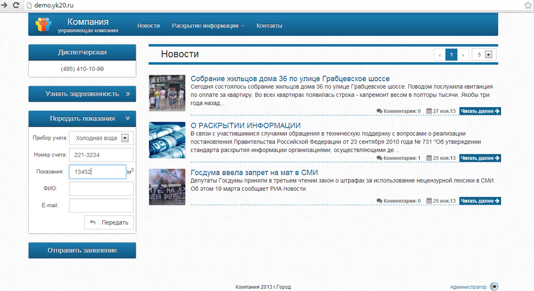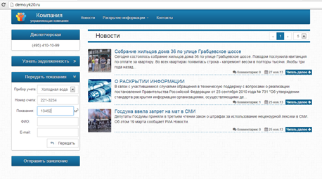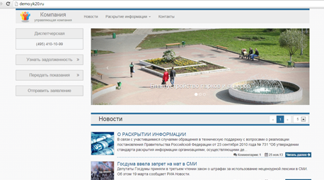 Готовый сайт размещается на нашей CMS разработанной с учетом потребностей управляющих организаций: раскрытие информации, прием показаний и заявлений, предоставление информации по задолженности и других.