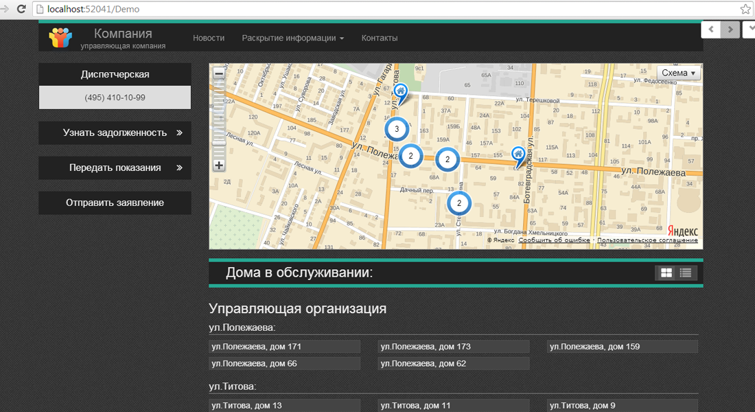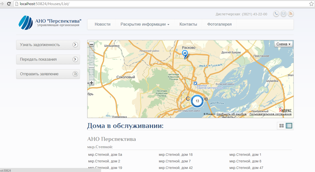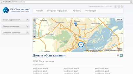 Перечень домов находящихся в обслуживании. Фотографии, расположение на карте, информация по проводимым работам, прикрепление соответствующей документации.